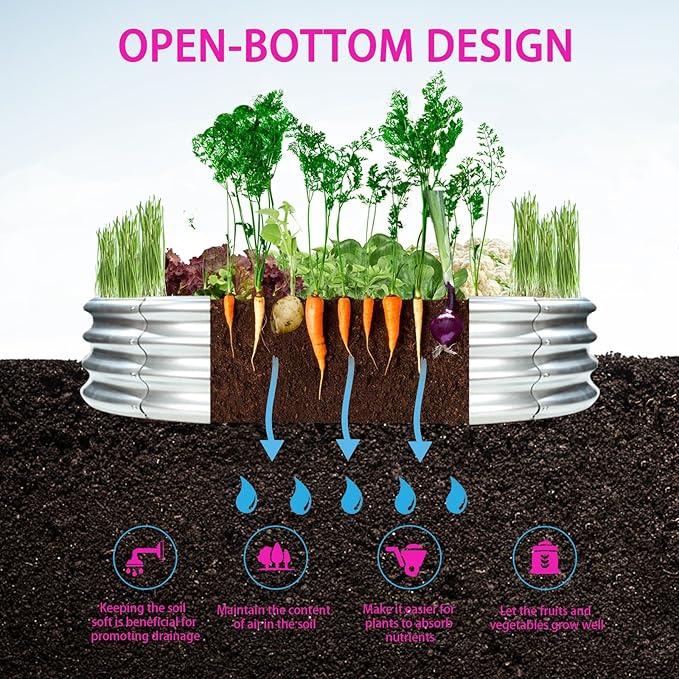 - 【OPEN BOTTOM】: This galvanized raised garden beds have open bottom design,which promotes healthy drainage and allows for deeper root growth, ensuring your plants thrive
