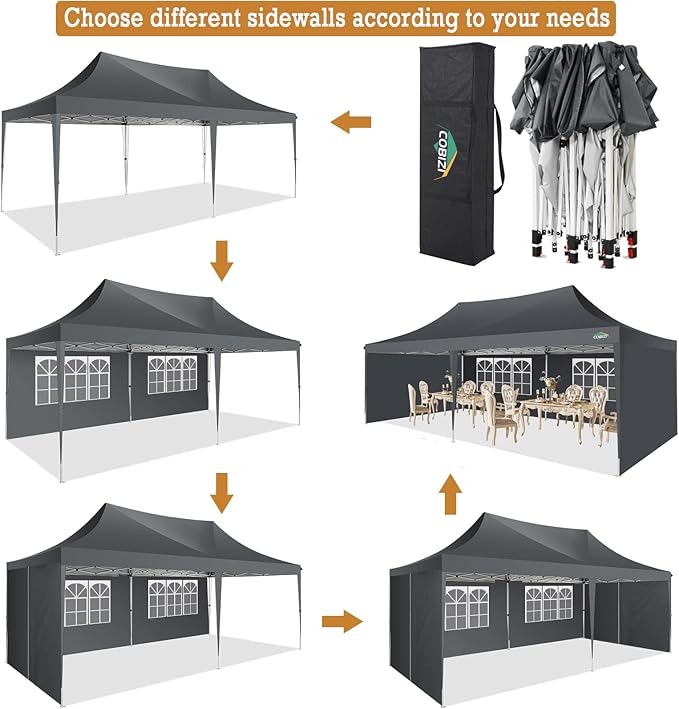 - Easy to assemble: COBIZI pop up tent 10x20 does not require any tools and can be assembled by only 2-3 people. letting you spend more time enjoying the great outdoors and less time wrestling with equipment.