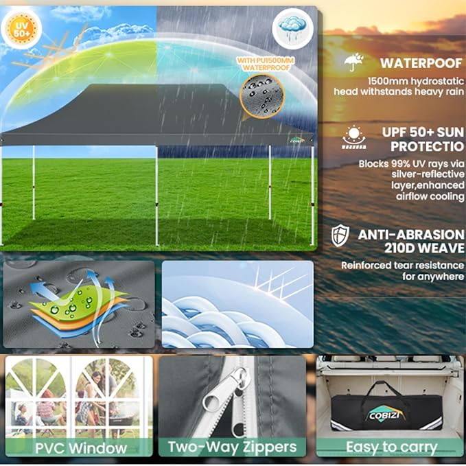 - 3.0 Upgrade Structure and Material: COBIZI Canopy Tent 10x20 has a strong structure and frame made of powder-coated and high-strength steel pipe, which is durable and rustproof. 10x20 tent fabric is made of 210D Oxford fabric with double PU coating, UPF 50+, which can block 99% of harmful rays. All seams are taped to prevent leaks .
