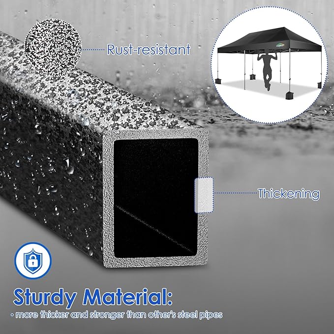 - ✦High Quality Frame Upgrade: High quality powder coated aluminum frame brings incredible strength to this heavy duty pop up canopy,at the same time rust and corrosion resistant. The newly upgraded 32mm steel tube diameter & 0.7mm wall thickness have significantly improved strength compared to other tents on the market and help to provide strong support, can carry up to the weight of 8 people at the same time. With sandbags and wind ropes,it can be stable in winds of 50 km/h.
