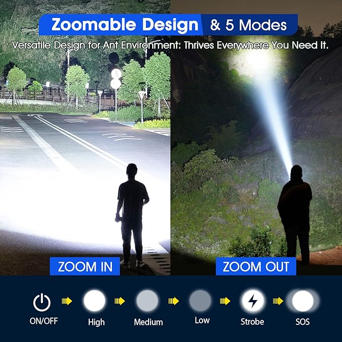 - Zoomable & 5 Lighting Modes: Our flashlights for camping boast 5 lighting modes: high, medium, low, strobe, and SOS, fulfilling your varying usage needs in any situation; Whether you need long-distance observation or wide-range lighting, pull on the LED flashlight's head zoom to achieve the desired effect; It's ideal for camping, hiking, dog walking, fishing, outdoor adventures, also the emergency power-off backup