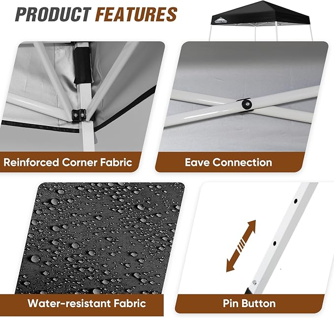 - EASILY ADJUSTABLE: The leg height has three settings to quickly adjust the canopy height and angle to maximize shade throughout the day. 64 square feet of shade, large enough for 5 people. (Slant leg design is 8'x8' at base and 6'x6' at the top)