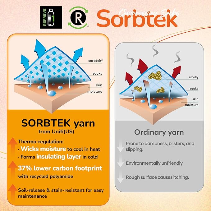- REPREVE Sorbtek:Stay cool, dry, and comfortable all day long with innovative REPREVE Sorbtek moisture-wicking fibers from USA. These advanced yarns are specially engineered to quickly draw sweat and moisture away from your skin, helping to regulate temperature and prevent odor. Whether you’re working, traveling, exercising, or spending hours on your feet, these socks keep your feet feeling fresh, dry, so you can focus on your day with total confidence and ease.