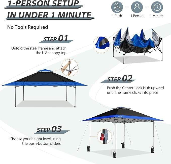 - EASY SETUP: This easy setup pop up canopy tent features the Peak Push system, a patented canopy center lock. The portable canopy requires no tools and easily opens and closes from the center in seconds. Its unique canopy tent center lock enables a quick, one person setup, letting you maximize outdoor time with minimal effort