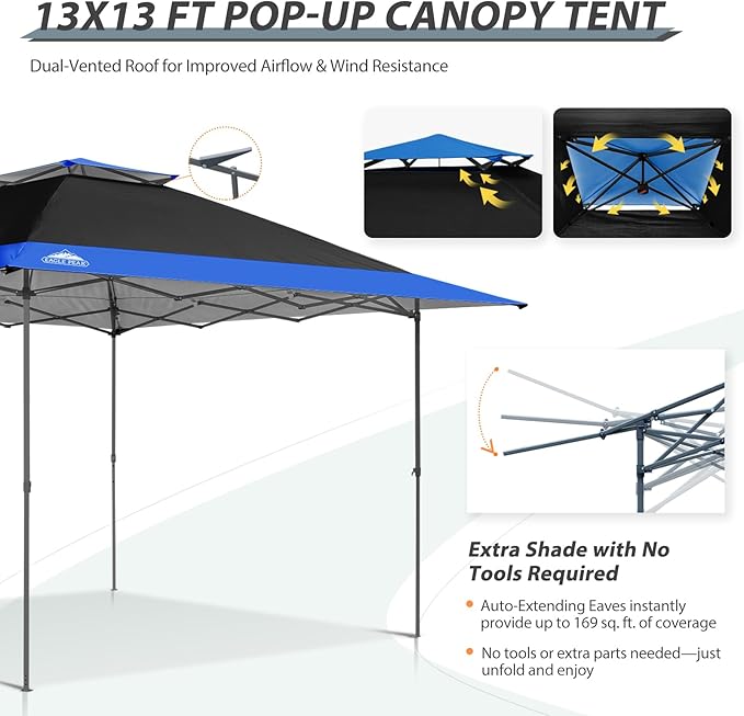 - VENTED TOP & AUTOMATIC EXTENDED EAVES: Stay cool with the EAGLE PEAK VENT that allows for greater airflow while you work or relax. The canopy’s automatically extending eaves open without any manual assembly and, combined with a sturdy straight-leg design, provides maximum coverage so 8 or more people can enjoy the spacious 169 square feet of shade. The easily adjustable telescoping 3-position steel frame is perfect for adjusting the canopy for your preferred coverage