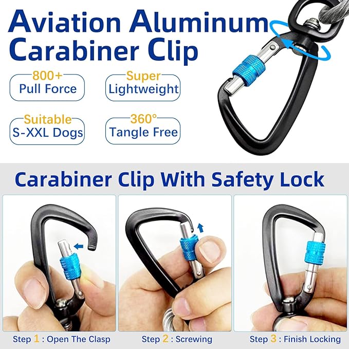 - AVIATION ALUMINUM CARABINER CLIPS:The 360°tangle free clips is made of top quality rust-free aviation aluminum, which is very lightweight, give dogs more ease, but also durable enough to withstand the most intense pulling . The rotation tightening technology prevent loosing off when dog running and playing.