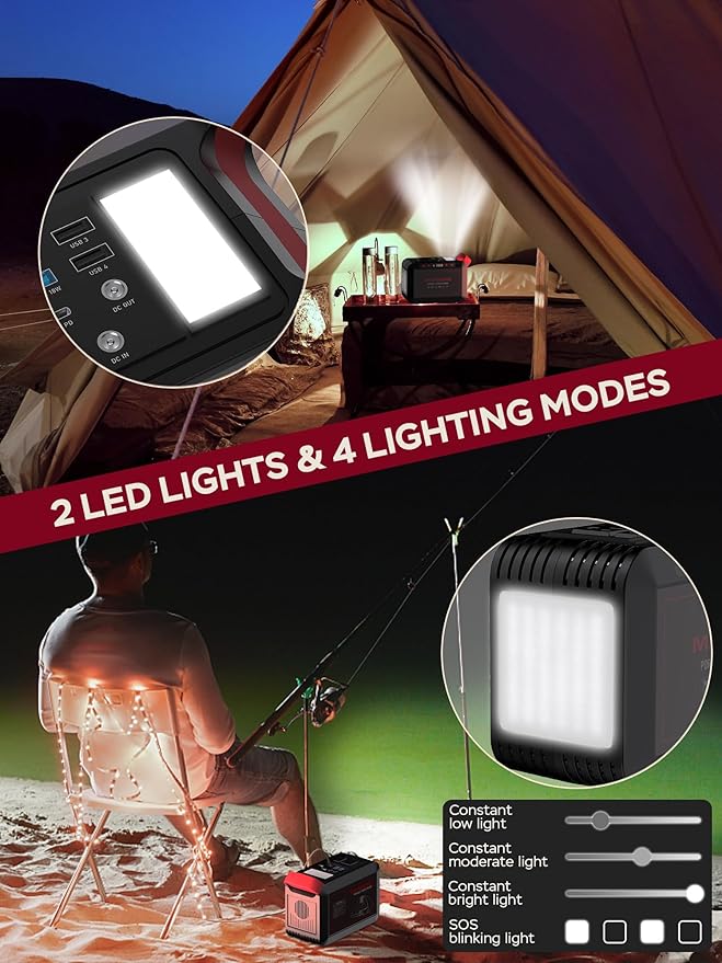 - LED CAMPING LANTERN: There are 2 LED flashlights as camping lantern, first one is on top of the device and the other one is on the side. The first one is built-in with 2 brightness levels, while the other one has 3 brightness levels and 3 lighting modes(steady, twinkling and SOS). Press the LED flashlight button to switch the brightness and SOS modes. When you go out camping or experience power outages, this function may help you out perfectly.