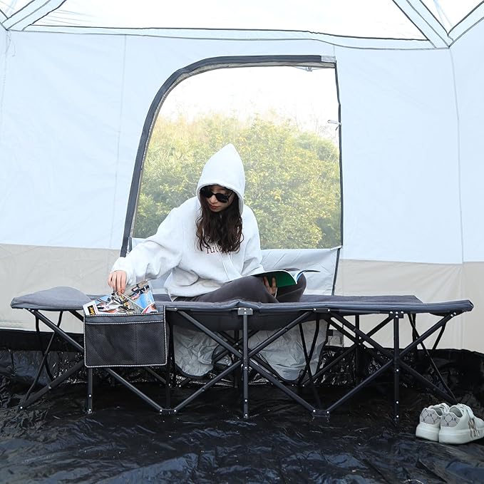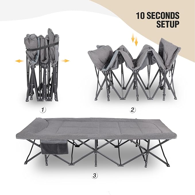 - Foldable & Portable: No eatra tools are needed to install the camping cot. You can open it within 10 seconds. Easy to fold when not in use. You can fold it in the equipped storage bag, then place it anywhere without occupying sapce.