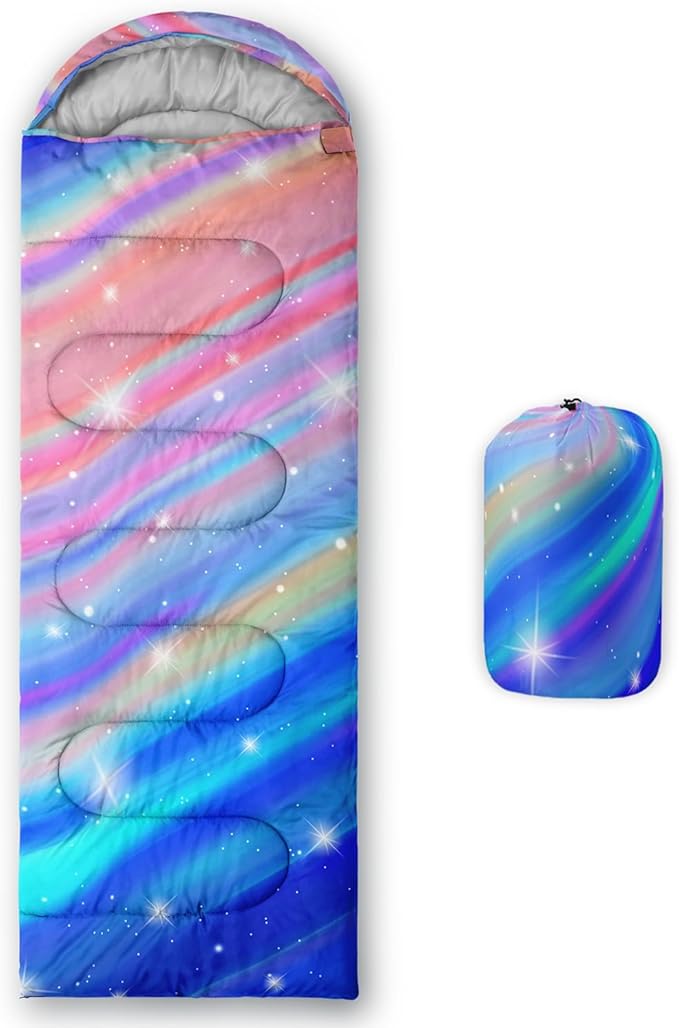 - Premium Material - The camping sleeping bag is made of premium 220T ripstop microfiber fabric,comfortable and breathable,lined with 220T cotton pongee. The waterproof outer protective shell is made of a unique hexagonal design and high-quality Material with double S-stitching and microfiber filling for optimal warmth and insulation to protect you from the elements. The bright colors are loved by boys and girls,great for kids and adults alike!