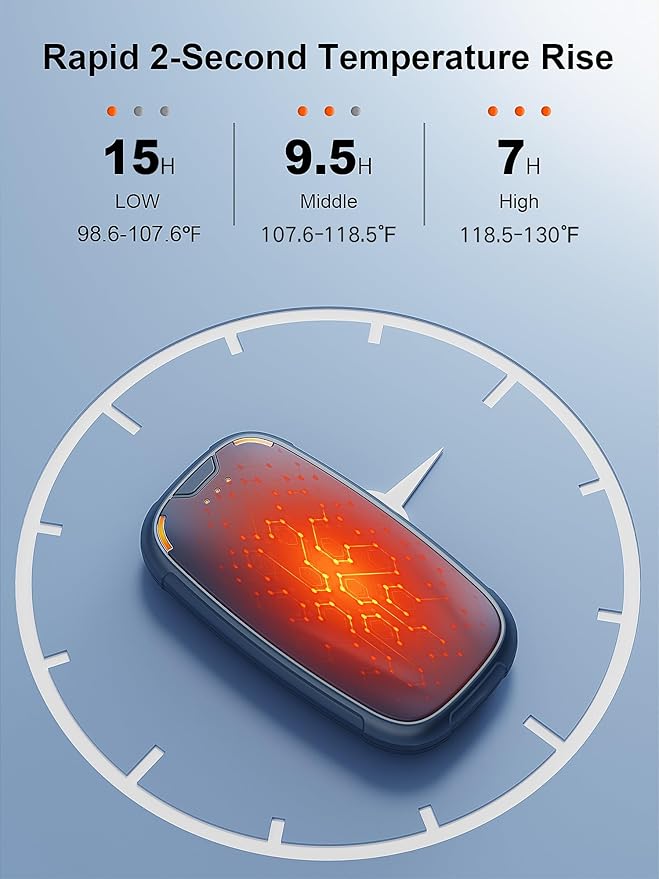 - 【Rechargeable & Three Levels of Temperature】Electric hand warmers, 5200mah rechargable hand warms with up to 12 hours battery life, USB hand warmer. With 3-speed indicator light, you can adjust three different temperatures, the use of time is 7-9.5-12 hours. Choose the right temperature for a comfortable using experience.