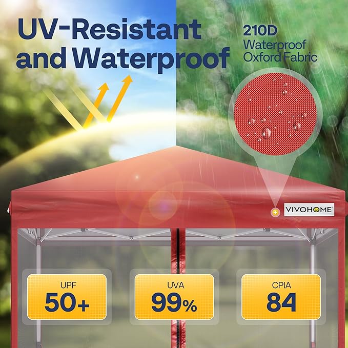 - PREMIUM MATERIAL - The screened gazebo tent is made from 210D silver-coated Oxford cloth with waterproof stickers, offering UPF 50+ protection and CPIA-84 flame retardant standards; It reflects 99% of harmful sunlight, ideal for outdoor use; The powder-coated steel frame resists scratches, rust, and corrosion; Note: it's recommended to retract the tent in strong winds and heavy rain for extended service life