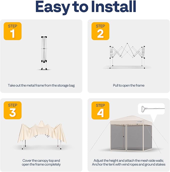 - SIMPLE INSTALLATION - The screened canopy comes with a pre-assembled pop up frame, making it effortless for a single person to set it up without needing additional tools; Adhesive straps firmly secure the top cover to the frame, and thumb-friendly buttons simplify adjusting the canopy height; The metal feet plate, ground nails, and wind ropes are combined to keep it firmly anchored to the ground in windy conditions