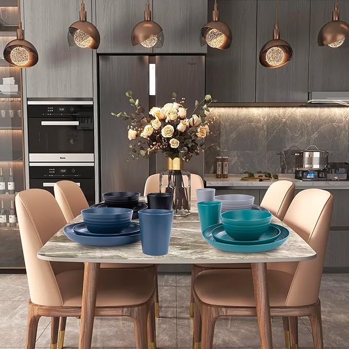 - 32pcs Wheat Straw Dinnerware Sets -The wheat straw dinnerware sets include 32 piece in total,color: black,dark gray,dark green,dark blue produced from wheat straw. Our wheatstraw dinnerware set ensures a sustainable dining experience,eliminating the need for disposable plastic plates,embrace a green lifestyle.