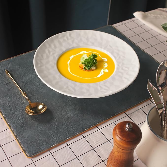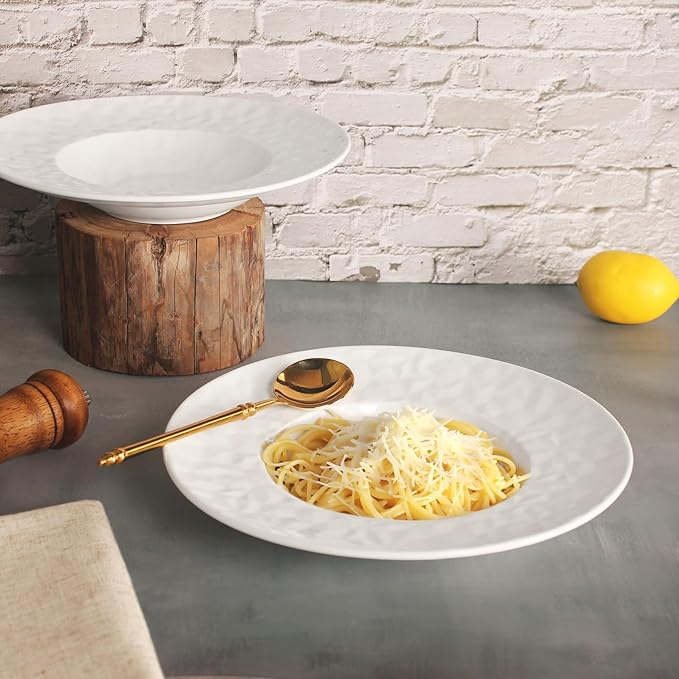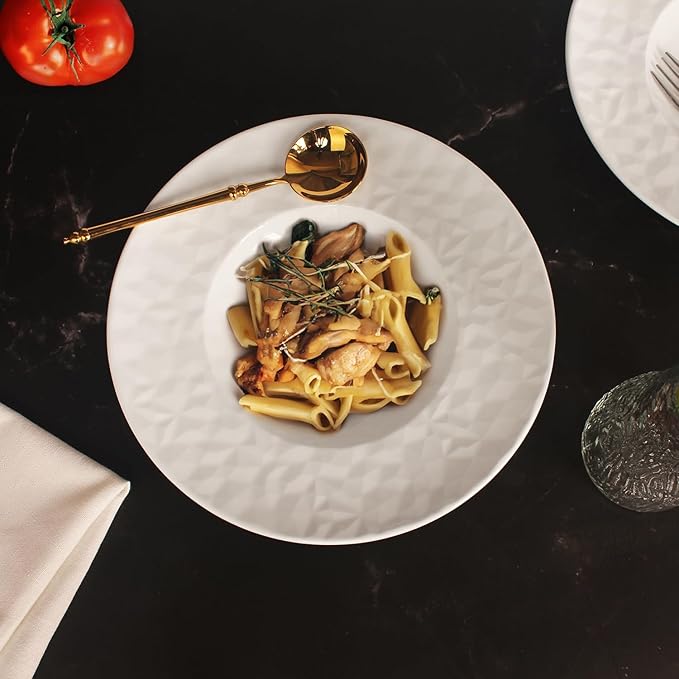- The porcelain glaze is designed with a gemstone texture and is very beautiful. Perhaps none of the tableware you have ever used is as beautiful as this one. When you get it, you're gonna love it. Bright Coloring White and Elegant Hat Shape Design, pasta bowls and dessert plates have industry-favorite traditional contours, ideal for various dining environments, from casual to the white tablecloth, can easily solve your color matching troubles.