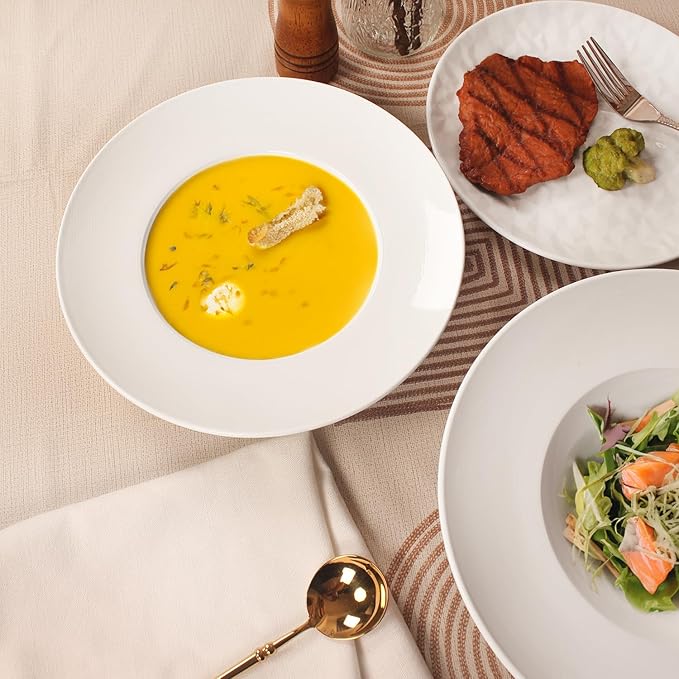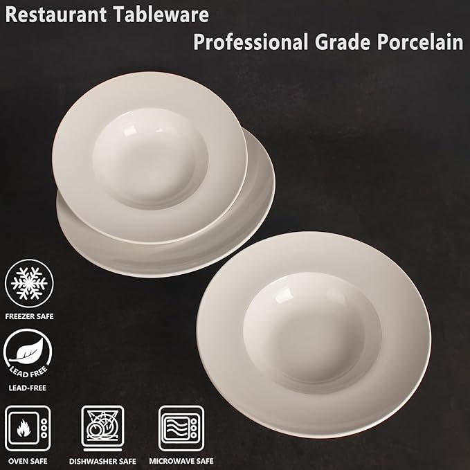 - The porcelain glaze is designed with a Line texture and is very beautiful. Perhaps none of the tableware you have ever used is as beautiful as this one. When you get it, you're gonna love it. Bright Coloring White and Elegant Hat Shape Design, pasta bowls and dessert plates have industry-favorite traditional contours, ideal for various dining environments, from casual to the white tablecloth, can easily solve your color matching troubles.