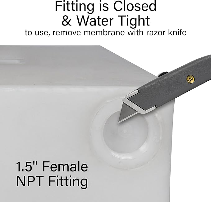 - EASY TO INSTALL WATER STORAGE TANK: Fitting locations allow multiple options for installation of the 19 gallon water tank; Built-in fittings include (TWO) 1.5" balloon style threaded female NPT standard and (TWO) 0.5" threaded female NPT standard