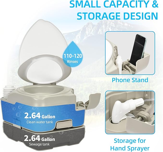 YITAHOME Portable Toilet 2.64 Gal Camping Porta Potty with Diagonal Enlargerd Bowl, Hand Sprayer and Press Flush Pump, Space Saving Indoor Outdoor Toilet for Adults, RV Travel, Boat and Trips