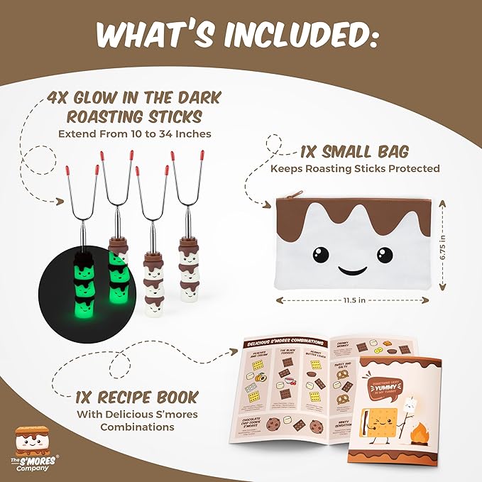 THE S'MORES COMPANY - Glow in the Dark Marshmallow Roasting Sticks - Set of 4 Rotating Smores Sticks - Telescoping Extra Long Marshmallow Sticks for Fire Pit, Campfire & Bonfire - Camping Accessories