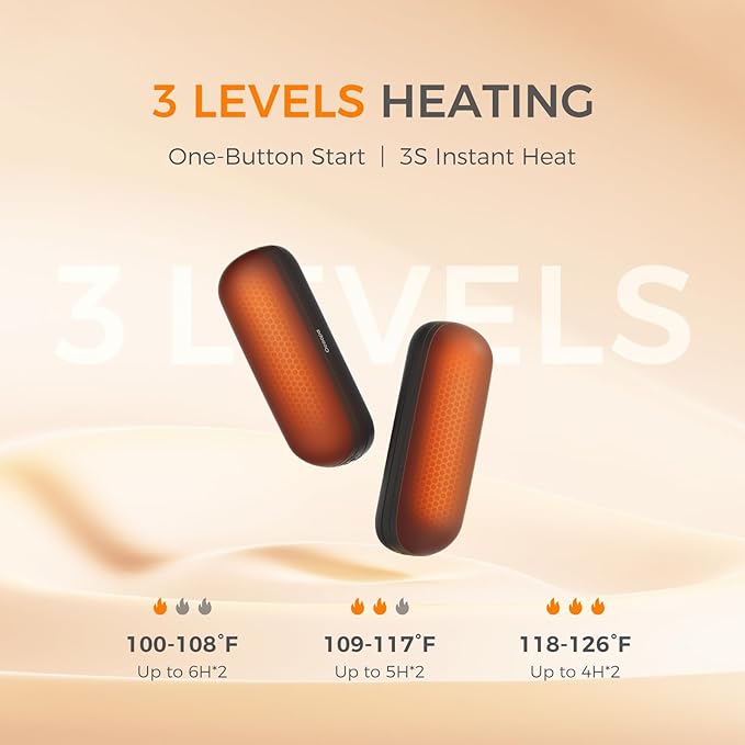 - ๐Instant Heat, Lasting Warmth: Heat release in just 3 Seconds, 3 temperature settings up to 126 ยฐF, Heat duration up to 4 to 6 hours; We offer a split USB-C charging cable, saving you charging time and allowing you to enjoy more warmth
