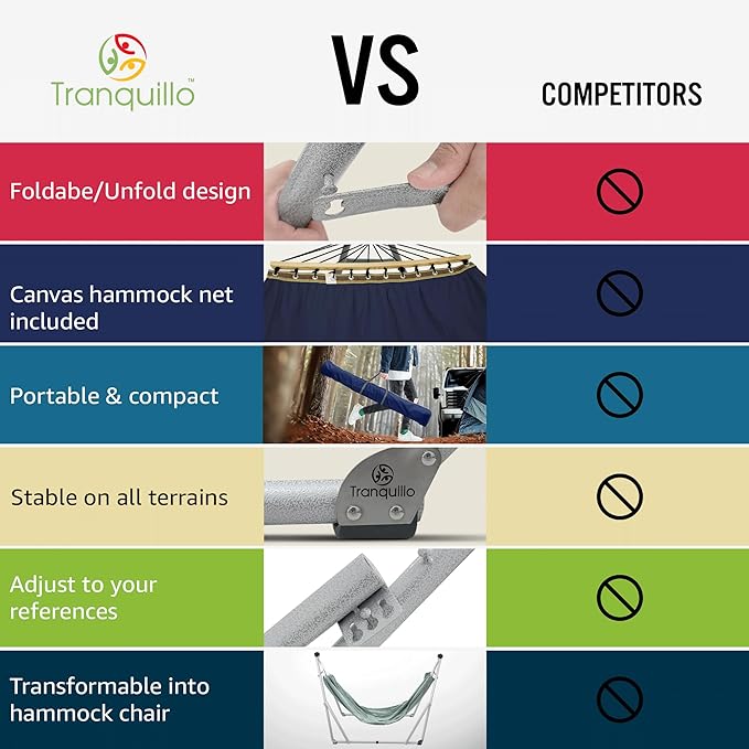 - PATENTED INNOVATIVE DESIGN: Proudly patented for its smart, tool- free setup in just 30 seconds, the Tranquillo Hammock with stand offers effortless outdoor relaxation. Easily adjustable for perfect comfort, built with durable materials for long-lasting use