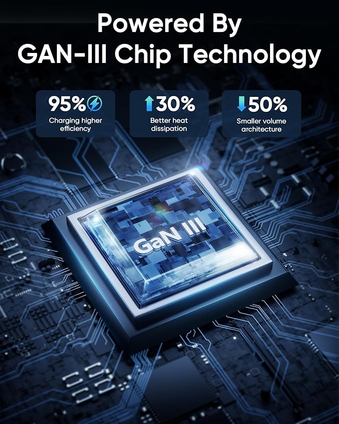 - 【2025 Latest GAN III Chip Technology】: The type c charging block uses GAN III chip technology with built-in multiple protection systems and premium microchips. Up to 95% charging efficiency and 63% smaller size, easily replacing traditional bulky and inefficient power adapters. With better heat dissipation capacity, the gan charger block protects your equipment from overheating, ensure security for you and your devices.