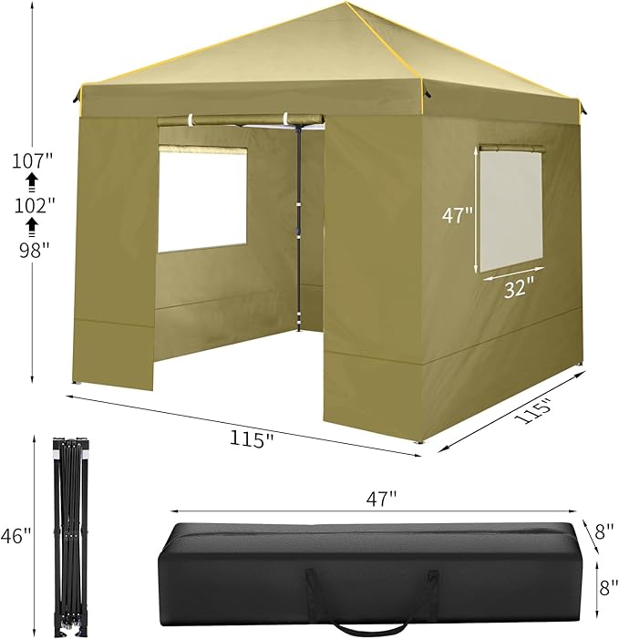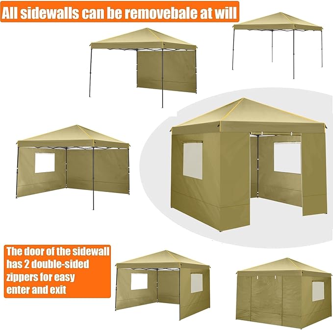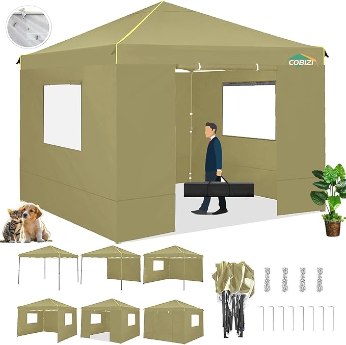 10x10 Pop Up Canopy Tent with 4 Sidewalls and Mesh Windows 2.0, Waterproof Commercial Instant Gazebo Outdoor Tents for Party/Exhibition/Picnic with Carry Bag,4 Stakes & Ropes (Khaki)