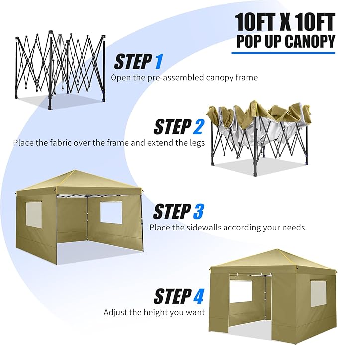 - STURDY STEEL FRAME AND TARPAULIN - Special thicken steel frame with anti-rust coating, it can prevent rust. The 10x10 ft pop up canopy tarpaulin is made of high density oxford cloth, the side of the 10x10 canopy tent is also made of oxford cloth. With the help of silver-plated PU lining, waterproof, UPF 50+, it can block 99% of harmful rays of sunlight.