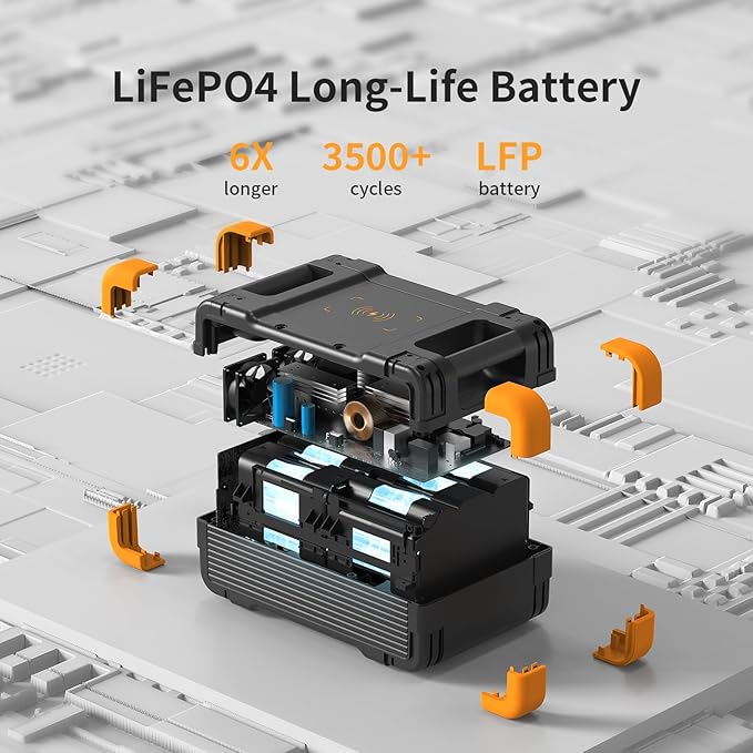 - SAFETY & DURABLE: The ultra-safe LiFePO4 battery with Built-in BMS assures the self-protection of short circuits, overloads, and overheating. 120V Pure-sine wave inverter makes sure there is no damage to your sensitive electronic devices.