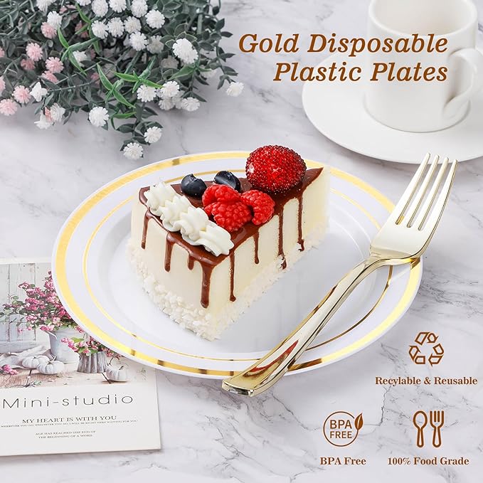 - ELEGANT DESIGN FOR VERSATILE OCCASIONS - With its gold rim and elegant white base, this plastic plate effortlessly fits any occasion, from vibrant parties and elegant weddings to casual gatherings. Despite its plastic composition, these party supplies radiate the sophistication of ceramic, elevating the event's allure and making a lasting impact on guests.