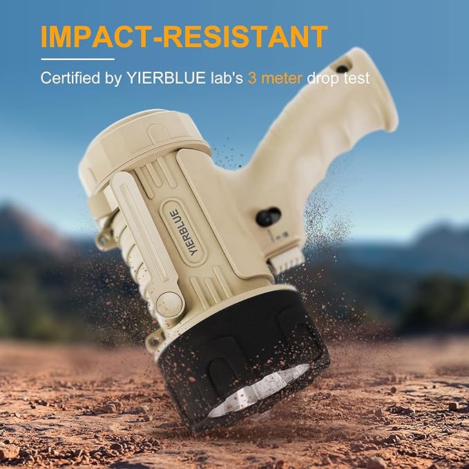 - WATERPROOF & FLOATING, IMPACT RESISTANT: This spot lights outdoor handheld is IP67 waterproof and submersible up to 3ft, and even float back up to the surface if it’s dropped in water. The High strength ABS housing with silicone protective case ensures maximum durability, rugged body withstands dropping from up to 10ft