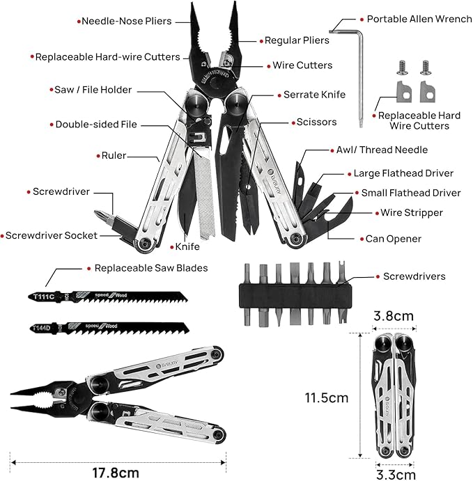 - Included Components : 1 x Multitool Pro Pliers, 16-in-1 Screwdriver Bits Set, 2 Replaceable Saw Blade, Hard-wire Cutter and Accessories, Nylon Pouch 1 x Multitool Pro Pliers, 16-in-1 Screwdriver Bits Set, 2 Replaceable Saw Blade, Hard-wire Cutter and Accessories, Nylon Pouch