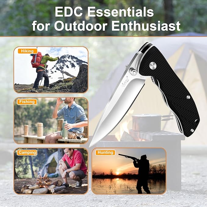 Vickay Pocket Knife for Men, Folding Knife with Clip, 3.74-inch 8Cr13MoV Steel Blade, G10 Handle EDC Knife for Outdoor Camping, Tactical, Hunting and Fishing Gift (Black)