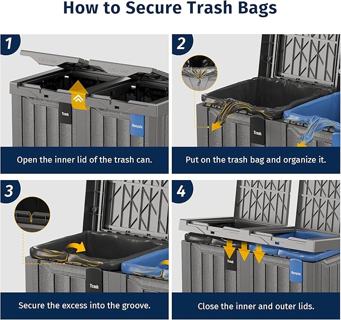 - ๐๐ป๐ต๐ฎ๐ป๐ฐ๐ฒ๐ฑ ๐จ๐๐ฒ๐ฟ ๐๐ ๐ฝ๐ฒ๐ฟ๐ถ๐ฒ๐ป๐ฐ๐ฒ: Our outdoor trash can for patio has a double-layer lid and rubber cushions to keep the garbage bag secure, even when itโs full and heavy. The inner ribbed structure ensures easy removal of the bag without tearing or scratching