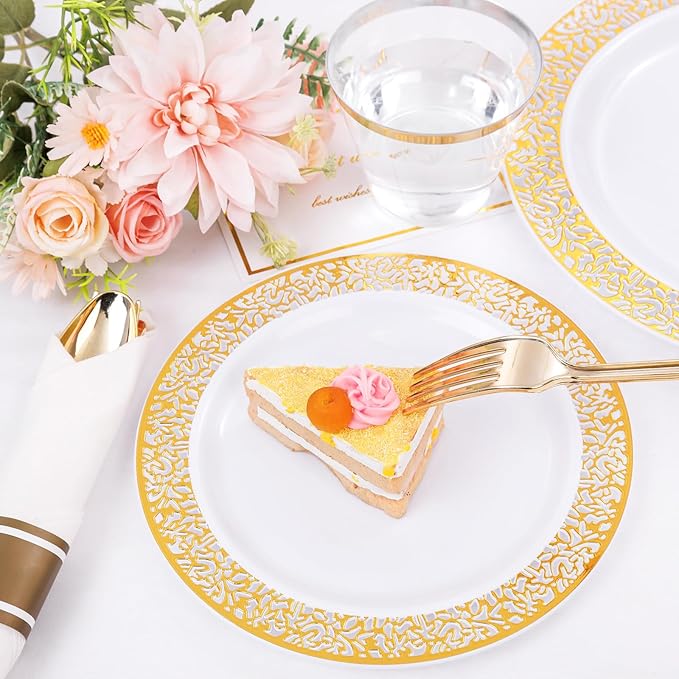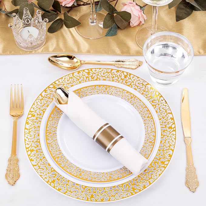 - GRACEFUL LACE DESIGN:The fine design and versatile color make it a perfect product to complement any color scheme.This gold plastic cutlery is designed with an ornate antique silver handle which is perfect match with our plastic plates for party and plastic tumblers.