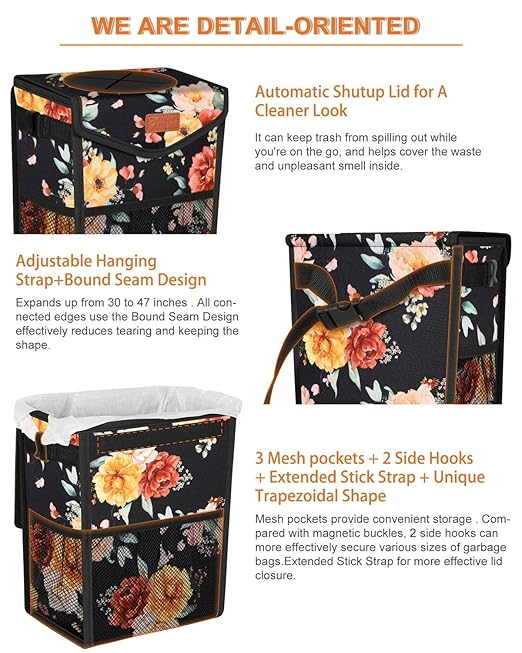 - Practical PU Leather Cover & Unique Trapezoidal Shape:A garbage bin without a lid is like a garbage display box, which is embarrassing when there are other passengers. A trash can with a lid can make it look cleaner and tidier. It can keep trash from spilling out while you're on the go, and helps cover the waste and unpleasant smell inside. Designed with a quick-sealing PU leather lid, which can put objects in by just pushing it through the lid, and it will shut off automatically.