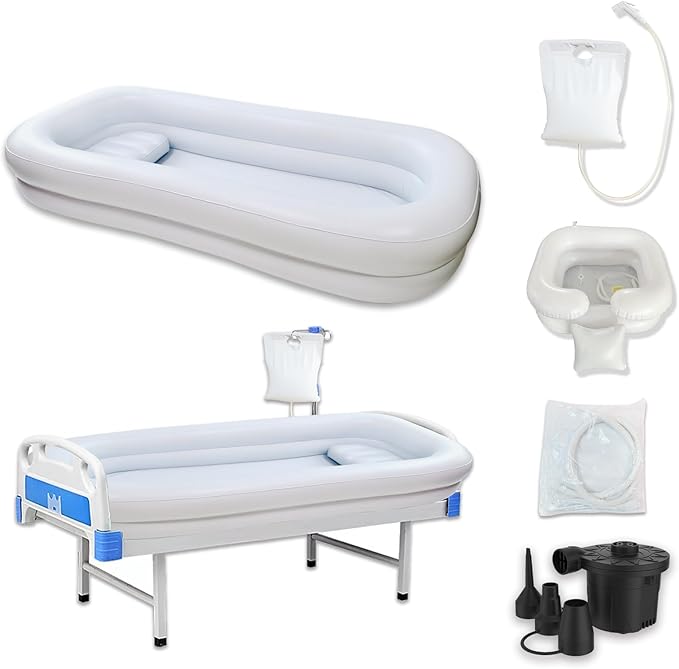 - Kit includes: Shower and bathtub kit includes: medical double-layer inflatable bed x1, bedside water bag x1, medical inflatable shampoo basin x1, shower head x1, electric pump x1, inflatable PVC pillow x1, drain pipe x1. When you want to take a bed bath, use our double-layer medical inflatable bathtub. When you just want to wash your hair, you can use a separate medical inflatable shampoo pool. Inflatable shower basin is very convenient for washing hair and bathing