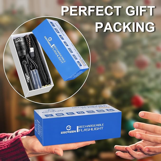 - [2025 UPGRADED HIGH BRIGHTNESS & LONG RANGE LED] The ESGREEN ED0330 rechargeable flashlights high lumens is made of a upgraded PH-L330 30W LED which has a feature of high brightness and ultra long beam. The high powered flashlight provides ultra high brightness, it can easily illuminate the whole room and backyard. The ultra strong beam provides high concentration circle beam, so it can easily and clearly focus on objects up to 5000 feet away. It is ideal for camping, hiking, dog walk, riding etc
