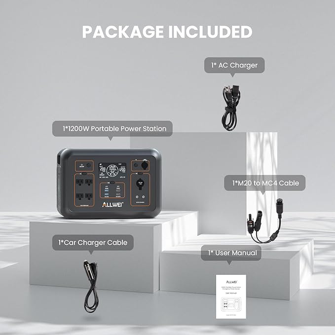 - Included Components : 1x AC Power Cable, 1x ALLWEI 1200W LiFePO4 Portable Power Station, 1x Car Cigarette Cable, 1x Solar Cable, 1x User Manual 1x AC Power Cable, 1x ALLWEI 1200W LiFePO4 Portable Power Station, 1x Car Cigarette Cable, 1x Solar Cable, 1x User Manual
