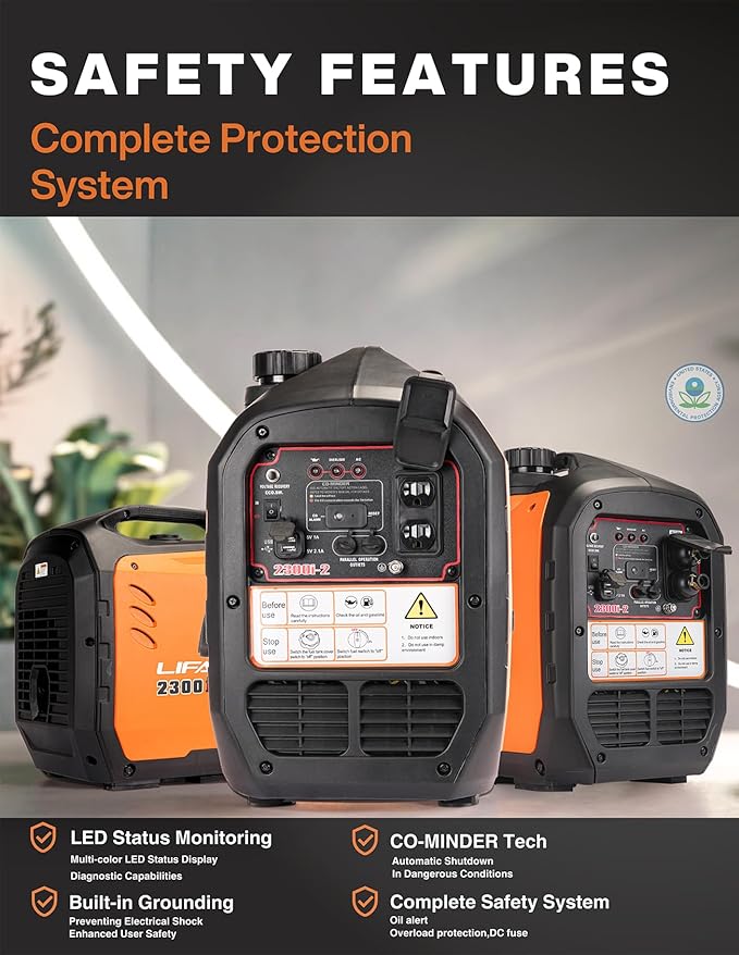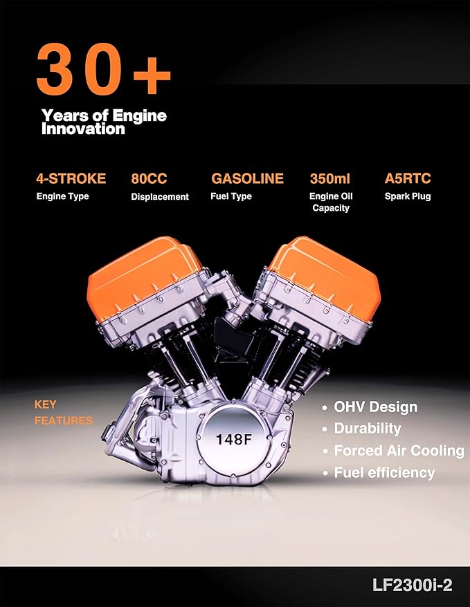 - 【Fuel-Efficient Performance with Parallel Capability】Achieve maximum fuel efficiency with our advanced engine design, offering longer runtime and reduced emissions. Need more power? Connect two 2300W generators using a parallel cable kit for increased output, perfect for high-demand appliances or tools.