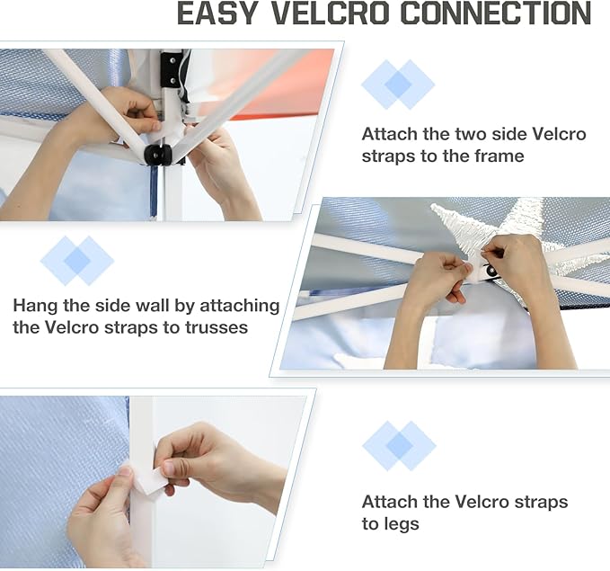 - REMOVABLE SIDEWALL: This outdoor canopy includes one detachable sidewall that secures to the frame with durable, extended Velcro straps. The 150D silver coated oxford canopy top is water resistant, offers UV protection, and meets CPAI-84 fire resistance standards. Enjoy reliable sun shelter and weather protection with heavy duty fabric designed for comfort and safety.