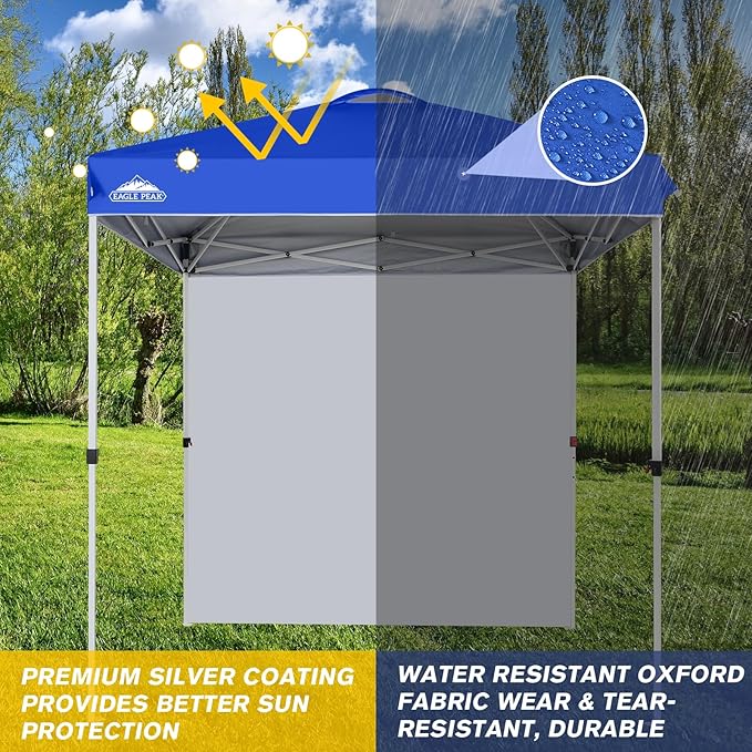 - DURABLE & SPACIOUS: This EAGLE PEAK event canopy provides shade for 3-6 people. Adjust the peak height easily with the pinch free leg release. Built with a powder coated steel frame and hardened through bolts, it ensures lasting durability. The coating resists rust and corrosion, making it an ideal event shelter for farmers' markets, the beach, parties, festivals, and sports events.