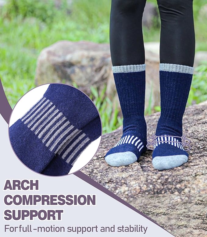 - ELASTICITY - These warm hiking socks for womens have high elasticity and arch stripe,which can enhance the blood moving ,relieve symptoms varicose and keep socks stable.They can greatly improve your comfort in hiking , running , walking , climbing , trekking or everyday wear.