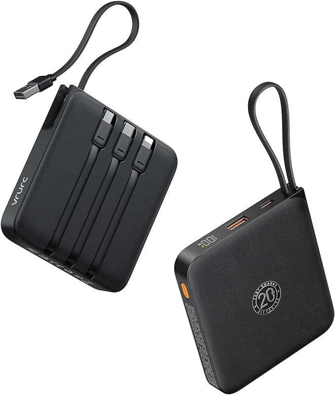 VRURC 20000mAh Portable Charger with Built-in Cables, Travel Essentials, 22.5W Fast Charging Power Bank for iPhone, Phone Battery Pack for iPhone 16 15 14 13 12 11 x Samsung Galaxy Series(1 Pack)