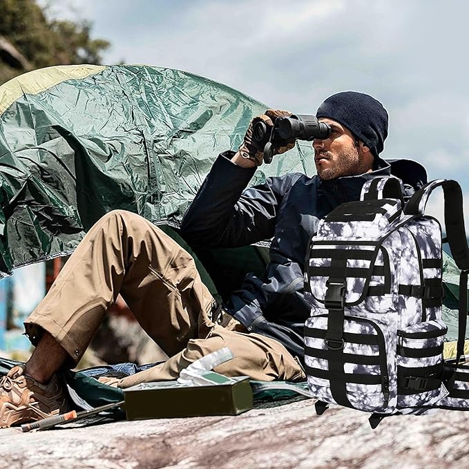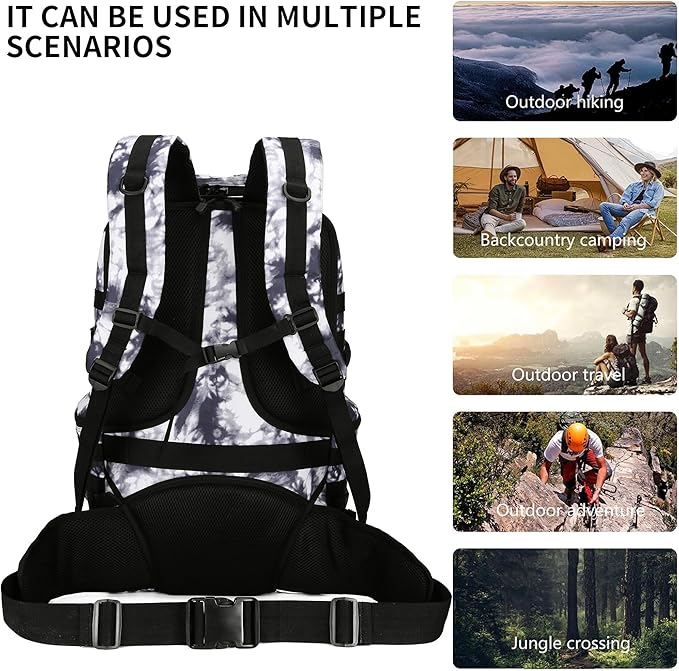 - 【Expanding space】 The camping durable backpack has multiple webbing and mounting systems, which can be bundled with outdoor equipment such as camera racks and moisture-proof mats, and can also be added with water bottles and accessory bags to effectively increase the space.