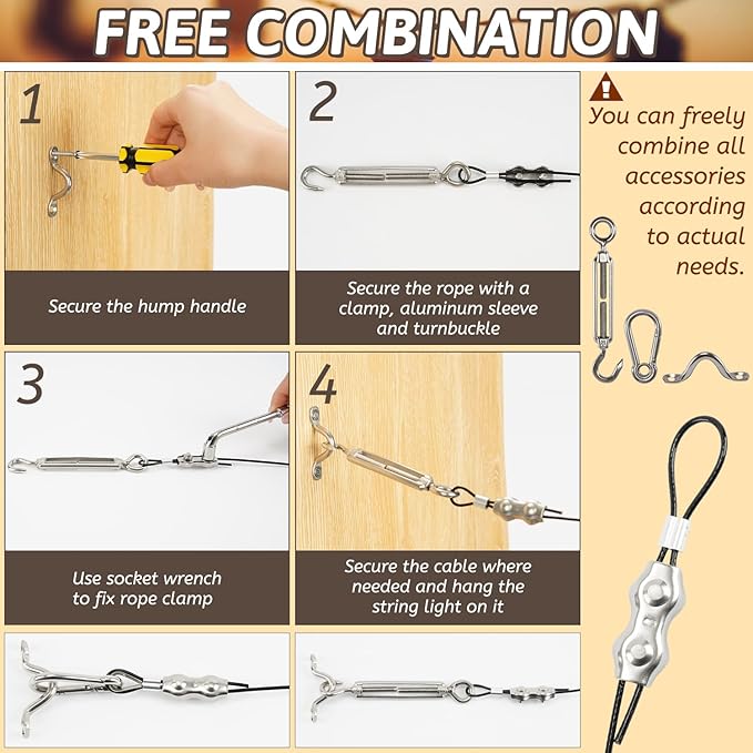 - Package List: Our string light kit comes with 13 different tools, including 2 x 200ft guide wire cable, 8 x Turnbuckles, 8 x Snap Hooks, 16 x Anti-wear thimble, 16 x Hump Handle, 16 x Rope Clamps, 20 Aluminum Crimping Loop, 32 x Screws, 32 x Expansion Pipe, 100 x Zip Ties, 1 x Wrench, 1 x Screwdriver, 1x Tape Measure, 1x Gloves. With string light decor season starting, it's time to invest in a high-quality string light hanging kit!