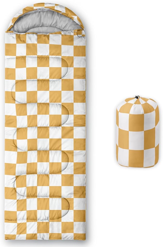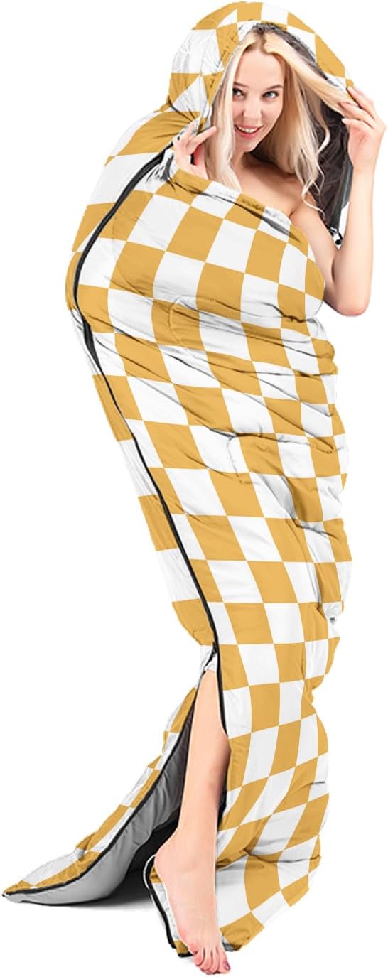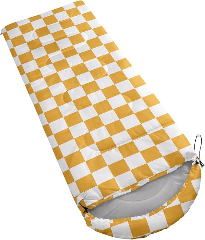 - Orange and White Check sleeping bags For All Seasons- Our camping sleeping bags are designed to give you a good night's sleep. Ideal for spring,summer,fall,and winter,rated from 32°F to 77°F (optimal comfort temperature is 50°F to 65°F). Stay comfortable and warm in any condition at normal altitude. Can be used for any outdoor adventure,class camping,summer camps,couch surfing,indoor blanket,and as an emergency blanket for vehicles.