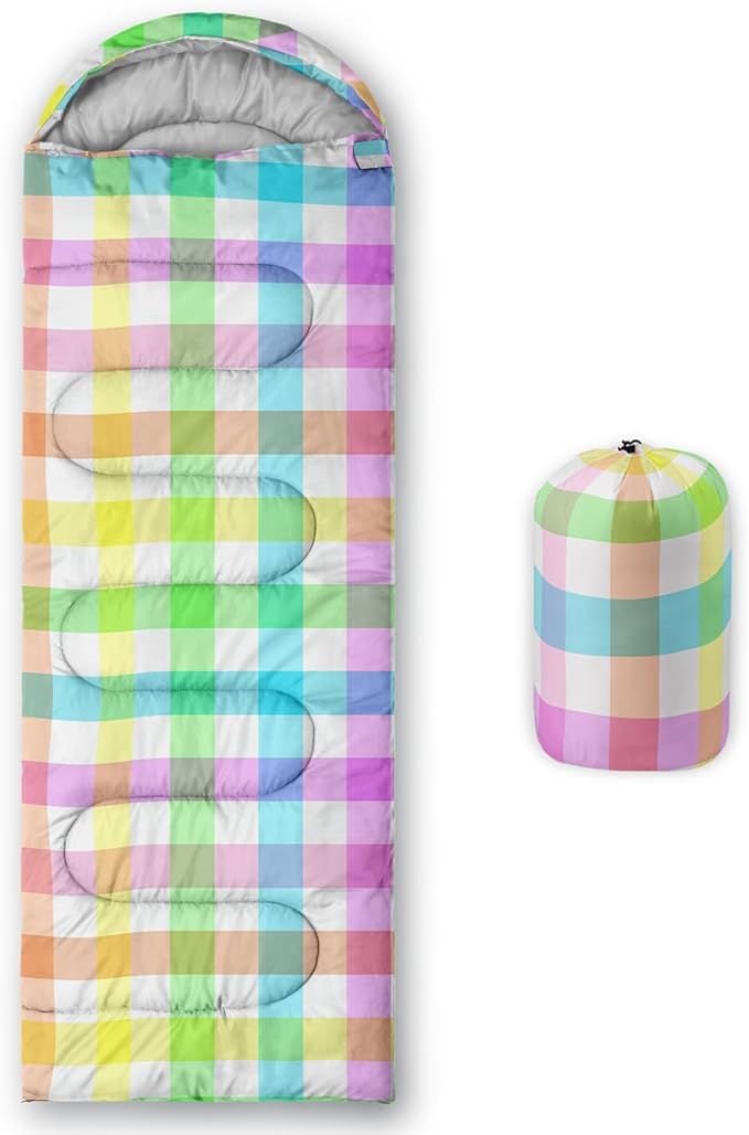 - Premium Material - The camping sleeping bag is made of premium 220T ripstop microfiber fabric,comfortable and breathable,lined with 220T cotton pongee. The waterproof outer protective shell is made of a unique hexagonal design and high-quality Material with double S-stitching and microfiber filling for optimal warmth and insulation to protect you from the elements. The bright colors are loved by boys and girls,great for kids and adults alike!