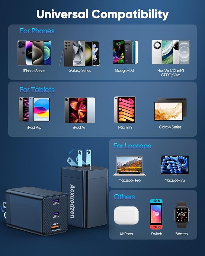 - 【3-IN-1 USB C Charger Block】: Acxuodzen 3-port usb c charger block with dual 65W type c charging ports & one 30W USB-A charging port(160W Total). The 65W high power charging port can charge your laptop fast and also provide super fast charge for your phone, iPad, iWatch, Switch and other electronic devices. Faster charging speed than regular 20W/30W/40w/45W chargers, greatly shortens your charging time. Our 1 charger block equivalent to 3 single-port charger blocks, can save your outlet space.
