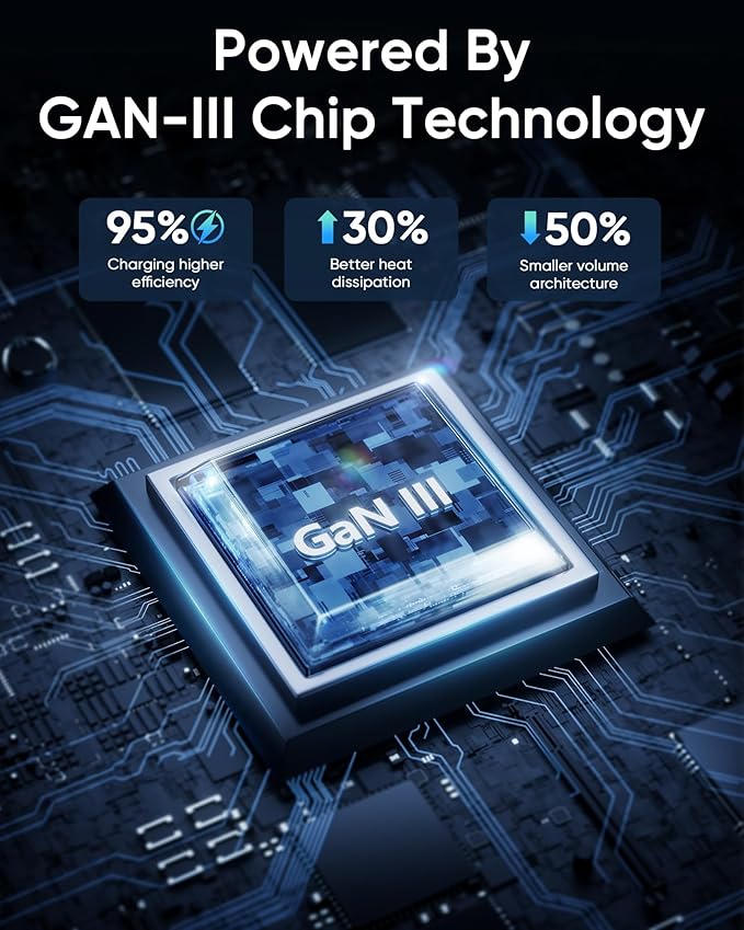 - 【2025 Latest GAN III Chip Technology】: The type c charging block uses GAN III chip technology with built-in multiple protection systems and premium microchips. Up to 95% charging efficiency and 63% smaller size, easily replacing traditional bulky and inefficient power adapters. With better heat dissipation capacity, the gan charger block protects your equipment from overheating, ensure security for you and your devices.