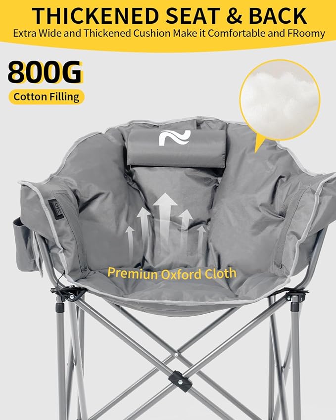 - Moon Saucer Chair: Folding camping chair has moon shape seat, ergonomic design, provide a large area of seat. Completely padded provides extra comfort and support. You can sit cross legged or sideways comfortable to relax in and enjoy your camping. Oversize padded moon leisure portable stable comfortable folding chair for camping, hiking,